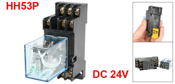 Product Name Electromagnetic Relay Model No. HH53P Socket Model No. DYF11A Coil Voltage DC 24V Contact Capacity 5A 250VAC /28VDC Type 3PDT Number of Terminals 11 Mount Rail Type 35mm DIN Rail Fixing Mount Hole Size 6 x 4mm/0.24" x 0.16"(L*W) Total Size (Approx.) 71 x 30 x 65mm/2.8" x 1.2" x 2.6"(L*W*H) Shell Material Plastic Main Color Black, Clear Blue Net Weight 68g Package Content 1 x Electromagnetic Relay - Reviews