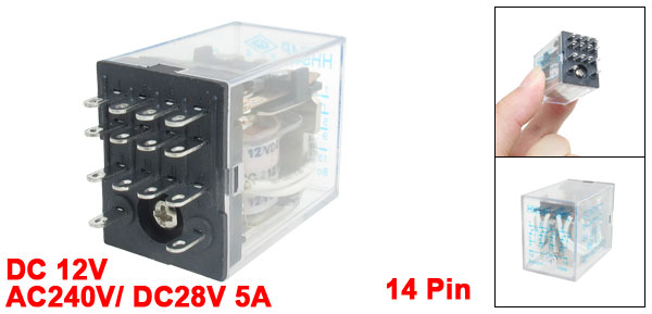 DetailsHH54P 12V DC Coil General Purpose Power Relay 14 Pin 4PDT Hzmag  Product Name Power Relay Model HH54P Pin Number 14 Coil Voltage DC 12V Contact AC240V/ DC28V 5A Size (Approx.) 3.5 x 2.7 x 2cm / 1.4" x 1.1" x 0.8" (L * W * T) Material Plastic Color Clear, Black Weight 33g Package Content 1 x Power Relay