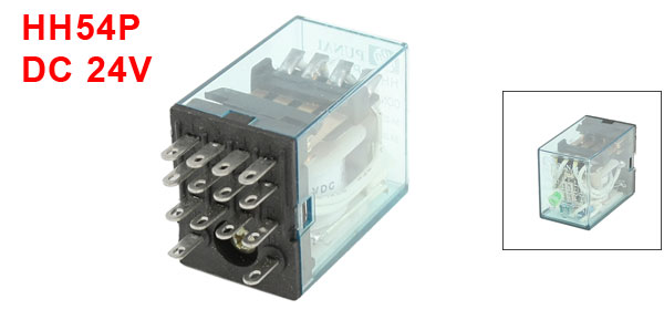 DetailsHH54P DC 24V Coil 4PDT 14-Pin 14P Electromagnetic Power Relay  Product Name Electromagnetic Relay Model No. HH54P Coil Voltage DC 24V Contact Capacity 5A 250VAC Type 4PDT Pin Quantities 14 Pin Width 2.6mm/0.1" Overall Size (No Include Pin) 21 x 27 x 35mm/0.8" x 1.1" x 1.4"(L*W*H) Shell Material Plastic Main Color Clear Blue, Black Net Weight 32g Package Content 1 x Electromagnetic Relay