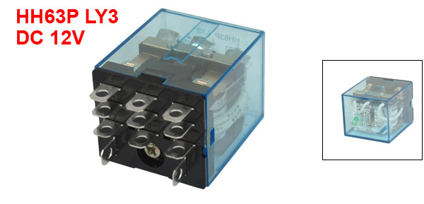 Product Name Electromagnetic Relay Model No. HH63P LY3 Coil Voltage DC 12V Contact Capacity 5A 240VAC /28VDC Type 3PDT Pin Quantities 11 Pin Size 6 x 5mm/0.24" x 0.2"(L*W) Overall Size (Approx.) 31 x 27 x 36mm/1.2" x 1.1" x 1.4"(L*W*H) Shell Material Plastic Main Color Blue Clear, Black Net Weight 51g Package Content 1 x Electromagnetic Relay - Reviews