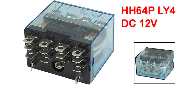 Product Name Electromagnetic Relay Model No. HH64P LY4 Coil Voltage DC 12V Contact Capacity 10A 240VAC /28VDC Type 4PDT Pin Quantities 14 Pin Size 6 x 5mm/0.24" x 0.2"(L*W) Overall Size (Approx.) 31 x 27 x 36mm/1.2" x 1.1" x 1.4"(L*W*H) Shell Material Plastic Main Color Blue Clear, Black Net Weight 66g Package Content 1 x Electromagnetic Relay - Reviews