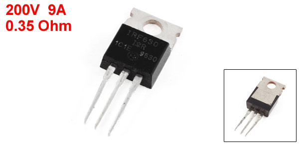 Product Name MOSFET Model No. IRF630 Channel Type N-Channel Pin Quantity 3 Drain Source Voltage 200V Drain Current 9A Package Type TO-220 Resistance 0.35 Ohm Mounting Hole Diameter 3.6mm/ 0.14" Total Size 29x 10 x 4mm/1.1" x 0.39" x 0.16" (L*W*H) Weight 3g Package 1 x N-Channel Power MOSFET - Reviews