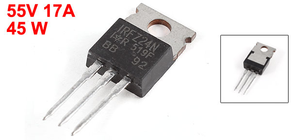 Product Name MOSFET Model No. IRFZ24N Channel Type N-Channel Pin Quantity 3 Drain Source Voltage 55V Drain Current 17A Package Type TO-220 Power 45 W Mounting Hole Diameter 3.6mm/ 0.14" Total Size 29x 10 x 4mm/1.1" x 0.39" x 0.16" (L*W*H) Weight 3g Package 1 x N-Channel Power MOSFET - Reviews