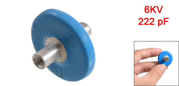 DetailsHigh Voltage Ceramic Doorknob Capacitor Blue 6KV 222 pF  Product Name Doorknob Capacitor Voltage 6KV Capacitance 222 pF Thread Size 3mm/ 0.118'' Overall Size 26 x 23.5mm/ 1.02'' x 0.92''(D*H) Material Ceramic, Metal Color Blue, Silver Tone Net Weight 18g Package 1 x Doorknob Capacitor