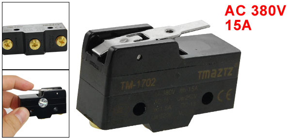 Product Name Micro Switch Model No. TM1702 Action Type Momentary Contact Type 1NO 1 NC Actuator Type Lever Hinge Voltage/ Current Ui: AC 380V, Ith 15A Ue/ Ie AC 250V 1.5A DC 220V 0.3A Switch Body Size(Each) 50x 17 x 30mm/ 2" x 0.67" x 0.12" (L*W*H) Lever Size 40 x 8mm/ 1.6" x 0.32(L*W) Hole Size 4mm Material Plastic & Metal Color Black & Silver Tone Net Weight 32g Package Content 1 x Micro Switch - Reviews
