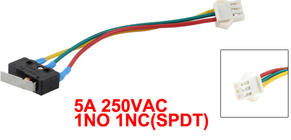 Product Name Micro Switch Rated Voltage & Current 5A 250VAC Contact Type 1NO 1NC(SPDT) Switch Body Size 2 x 1 x 0.6cm/ 0.7" x 0.4" x 0.2"(L*W*T) Lever Size 1.7 x 0.4cm/ 0.7" x 0.16"(L*W) Cable Length 8.3cm/ 3.2" Material(External) Plastic, Metal Color Black, Yellow, Red, Blue weight 5g Package Content 1 x Electrical Cooker Micro Switch(Non-OEM)  - Reviews