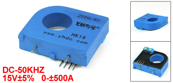 Product Name Current Transformer Model HK16 Working Frequency DC-50KHZ Working Power Supply 15V±5% Rated Current 200A Measuring Current Range 0-±500A Rated Output Voltage 4V Connector 4Pin PCB Mounting Size(Pins not Included) 40 x 10 x 32mm/1.6" x 0.4" x 1.3" (L*W*H) External Material Plastic, Epoxy Resin Color Blue Weight 24g Package Content 1 x Current Transformer - Reviews