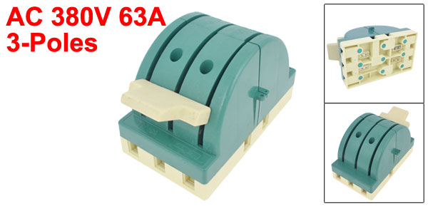 Product Name Opening Load Switch Model No. HK1D Type Double Knife Switch Pole 3 Rated Voltage AC 380V Rated Current 63A Installing Hole Diameter 3mm/0.12" Overall Size(Approx) 15.5 x 9.1x 9.6cm/6.1" x 3.6" x 3.8" (L*W*H) External Material Plastic, Metal Color Green, Yellow Net Weight 670g Package Content 1 x Opening Load Switch - Reviews