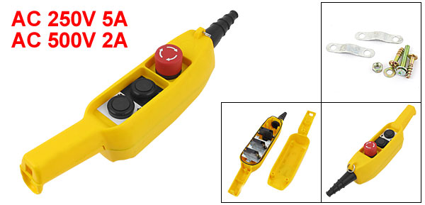 Main Color Yellow, Black, Red Brand DMiotech Country of Manufacture CHINA Model COB61E Electromagnetic Voltage & Current AC 250V 5A Material Plastic, Metal Contact Type Latching Stop Button, Momentary Up Down Button Feature Rainproof Type Product Name Hoist Pushbutton Switch Total Size(Approx.) 33 x 8 x 6cm/13" x 3" x 2.4"(L*W*H) Net Weight 427g Package Content 1 x Hoist Pushbutton Switch Jointing Sleeve Length 6.5cm/2.5" Rated Voltage & Current AC 500V 2A Push Buttons Up, Down, ON, OFF - Reviews