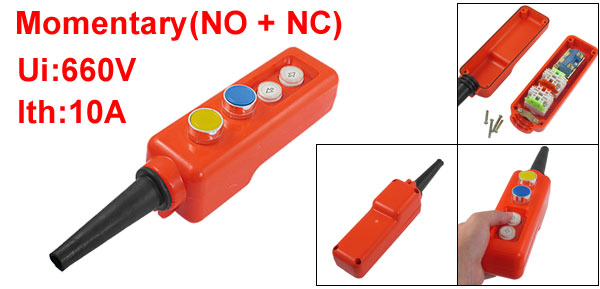 Product Name Hoist Pushbutton Switch Model No. COB COJ2059 Contact Type Momentary(NO + NC) AC-15 Ui:660V Ith:10A Push Button Color Yellow, Blue Main Body Size 20 x 5.8 x 6.5cm / 7.9" x 2.3" x 2.6"(L*W*H) Insulating Tube Length 10.2cm / 4" Fit Cable Diameter 1.1cm / 0.43" External Material Plastic, Rubber, Metal Color Orange Red, Black Net Weight 336g Package Content 1 x Hoist Pushbutton Switch - Reviews