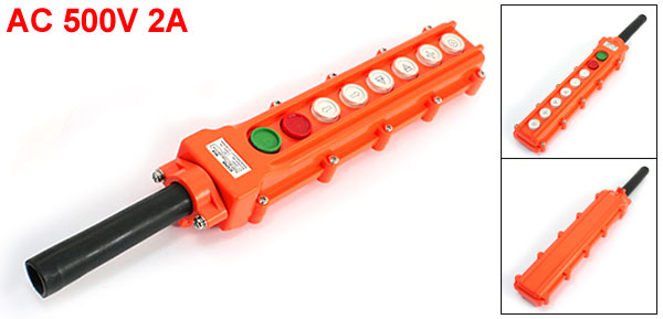 Electromagnetic Voltage & Current AC 250V 5A Rated Voltage & Current AC 500V 2A Type 6Way,8 Button Body Size(Approx.) 30 x 7 x 5cm / 11.8" x 2.8" x 2"(L*W*T) Jointing Sleeve Size 12.5 x 2.2cm / 4.9" x 0.87"(L*Dia.) Housing Material Plastic, Metal Color Orange Net Weight 403g Package Content 1 x Hoist Control Push Button Switch