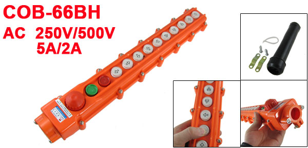 Product Name Hoist Control Station Model No. COB-66BH Usage for Hoist Crane Features Rainproof, 6 Ways with an Emergency Stop Knob Contact Type Latching, Rotary Release(Emergency Stop Knob) Momentary(Other Push Buttons) Rated Voltage & Current AC 250V/500V, 5A/2A Overall Size(Approx.) 47 x 7.5 x 5cm / 15.9" x 3" x 2"(L*W*T) Jointing Sleeve Size 12 x 2.9cm / 4.7" x 1.1"(L*Dia.) Housing Material ABS Color Orange Net Weight 752g Package Content 1 x Hoist Control Station 1 x Jointing Sleeve - Reviews