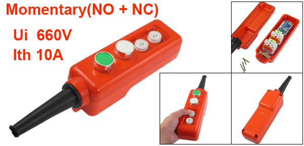 Product Name Hoist Pushbutton Switch Model No. COB COJ2058 Contact Type Momentary(NO + NC) AC-15 Ui:660V Ith:10A Push Button Color Green, White Main Body Size 20 x 5.8 x 6.5cm / 7.9" x 2.3" x 2.6"(L*W*H) Insulating Tube Length 10.2cm / 4" Fit Cable Diameter 1.1cm / 0.43" External Material Plastic, Rubber, Metal Color Orange Red, Black Net Weight 342g Package Content 1 x Hoist Pushbutton Switch - Reviews