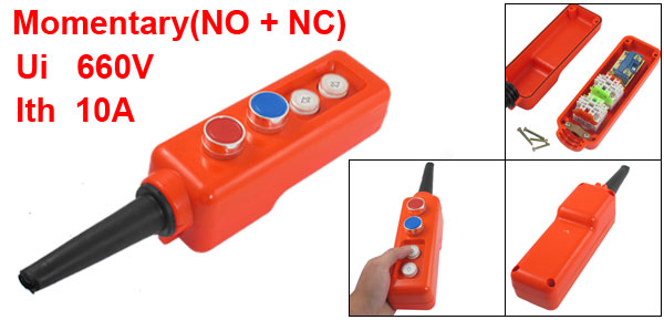 Product Name Hoist Pushbutton Switch Model No. COB COJ2052 Contact Type Momentary(NO + NC) AC-15 Ui:660V Ith:10A Push Button Color Red, Blue Main Body Size 20 x 5.8 x 6.5cm / 7.9" x 2.3" x 2.6"(L*W*H) Insulating Tube Length 10.2cm / 4" Fit Cable Diameter 1.1cm / 0.43" External Material Plastic, Rubber, Metal Color Orange Red, Black Net Weight 338g Package Content 1 x Hoist Pushbutton Switch - Reviews
