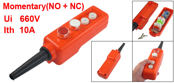 Product Name Hoist Pushbutton Switch Model No. COB COJ2054 Contact Type Momentary(NO + NC) AC-15 Ui:660V Ith:10A Push Button Color Red, White Main Body Size 20 x 5.8 x 6.5cm / 7.9" x 2.3" x 2.6"(L*W*H) Insulating Tube Length 10.2cm / 4" Fit Cable Diameter 1.1cm / 0.43" External Material Plastic, Rubber, Metal Color Orange Red, Black Net Weight 340g Package Content 1 x Hoist Pushbutton Switch - Reviews