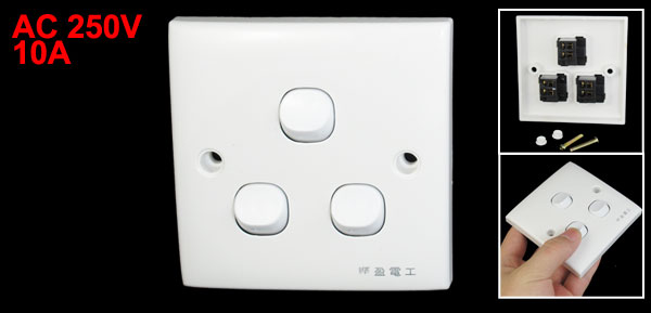 Product Name Switch Wall Plate Type SPST ON/OFF Shape Square Voltage AC 250V Current 10A Button Number 3 Gang Material Plastic, Electronic Parts Color White Installing Hole Diameter 4mm/0.2' Installing Hole Distance 60mm/2.4" Total Size 8.6 x 8.6 x 2.5cm/3.4'' x 3.4'' x 1'' (L*W*T) Weight 49g Package Content 1 x Switch Wall Plate
