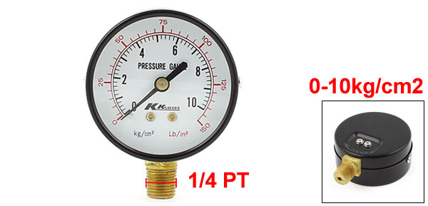 Product Name Pressure Gauge Range 0-10kg/cm2 / 150psi Total Size 63 x 30mm / 2.5" x 1.2" (D*T) Thread Diameter 13mm / 1/4 PT External Material Metal, Plastic Color Black, White, Brass Tone Net Weight 154g Package Content 1 x Pressure Gauge - Reviews