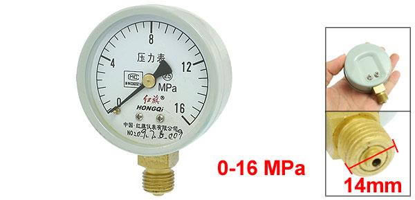 Product Name Pressure Gauge Range 0-16MPa Accuracy Class Class 2.5 Total Size 81 x 60 x 29mm/ 3.2" x 2.4" x 1.1" ((L*D*T) Thread Diameter 3/8" NPT(14mm) External Material Metal Color As Picture Shown Net Weight 118g Package Content 1 x Pressure Gauge - Reviews
