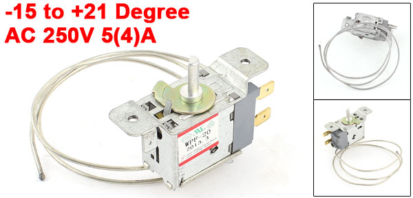 Product Name Refrigerator Thermostat Model WPF-20 Temperature Range -15 to +21 Degree Voltage Rating AC 250V 5(4)A Rated Frequency 50/60Hz Size 6.8 x 5.5 x 2.2cm / 2.7" x 2.2" x 0.87" (L*W*T) Cord Length(Approx.) 65cm / 25" Material Metal Color Silver Tone Net Weight 65g Package 1 x Refrigerator Thermostat - Reviews