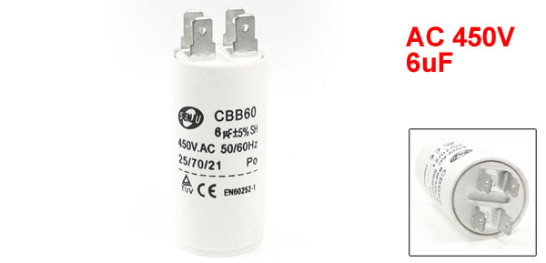 Product Name Motor Capacitor Material Polypropylene Film Model CBB60 Capacitance 6uF Tolerance ±5% Rated Voltage AC 450V Frequency 50/60Hz Body Size 38 x 70mm/ 1.5" x 2.75" (D * H) Color White Weight 47g Package Content 1 x Motor Capacitor - Reviews