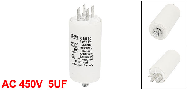 Product Name Motor Capacitor Material Polypropylene Film Model CBB60 Capacitance 5uF Tolerance +/-5% Terminals 4 Pin Rated Voltage AC 450V Frequency 50/60Hz Thread Dia 7.5mm/ 0.3" Body Size 34 x 70mm/ 1.3" x 2.75" (D * H) Color White Weight 76g Package Content 1 x Motor Capacitor - Reviews
