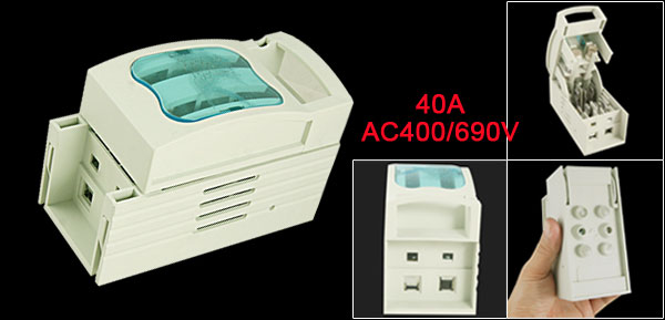 Product Name Fuse Disconnect Switch Model No. HR17B-40/200 Rated Voltage AC400/690V Rated Current 40A Rated Limiting Short Current 50kA Poles Quantity 2 Fuse Type 14 x 51mm / 0.551" x 2.008"(D*H) Overall Size(Approx) 11.6 x 5.6 x 7.6cm / 4.5" x 2.2" x 3"(L*W*H) External Material Plastic Color See the Picture Net Weight 235g Package Content 1 x Fuse Type Disconnect Switch - Reviews