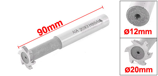 Product Name T Slot End Mill Material HSS-E Color Gray Cutting Diameter 20mm/3/4" Cutting Depth 3mm/ 3/25" Shank Diameter 12mm/1/2" Total Length 90mm/3.5" Weight 87g Package Content 1 x T Slot End Mill