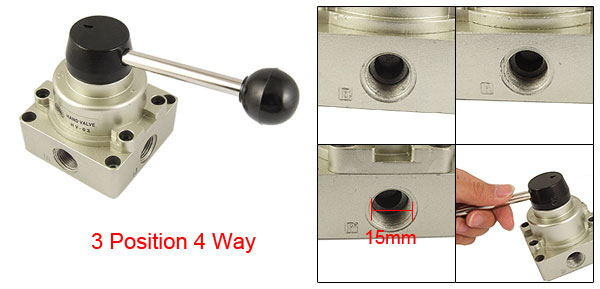 DetailsHV-03 Air 3 Position 4 Port Manual Hand-Switching Valve  Product Name Hand Valve Model HV-03 Working Medium Filter Compress Air Type 3 Position 4 Way Joint Pipe Bore G3/8" Working Pressure 0.05~0.8Mpa Thread Diameter 15mm/0.59" Material Plastic, Metal Color As Picture Show Valve Size 7.2 x 7.2 x8.7cm/2.8" x 2.8" x 3.4"(L*W*H) Ball Lever Size 7 x 2.7cm/2.75" x 1"(L*Max.D) Net Weight 458g Package Content 1 x Hand-Switching Valve