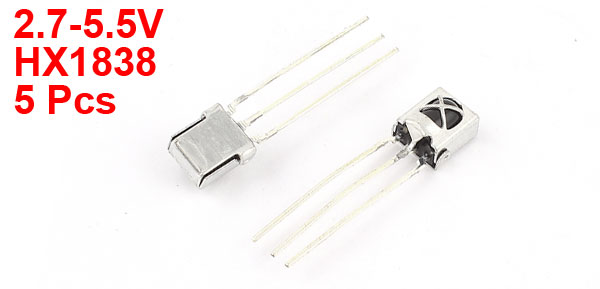Product Name Infrared IR Receiver Model HX1838 Working Voltage 2.7-5.5V Power Dissipation 35mW Reception Distance Min:10m Pins 3 Pin Size 21 x 2mm/0.83" x 0.08"(L*Pitch) Body Dimension 7 x 6 x 5mm/0.28" x 0.24" x 0.2"(L*W*T) Total Length 30mm/ 1.2" Material Plastic, Electric Components Color Black, Silver Tone Net Weight 4g PakcageContent 5Pcs x Infrared IR Receiver - Reviews