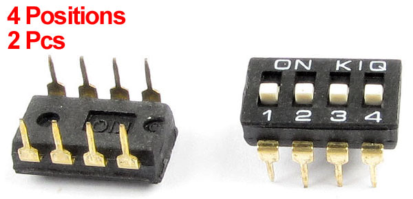 Product Name DIP Switch Type IC Type Features 4 Positions( 2 Row 8 Pin) Pitch 2.54 mm / 0.1" Non-Switching Rating 100mA DC 50V Switching Rating 100mA DC 24V Each Size 11 x 8 x 8mm / 0.43" x 0.31" x 0.31" (L*W*H) Main Material Plastic, Metal Color Gold Tone, White, Black Net Weight 3g Package Content 2 x DIP Switch - Reviews