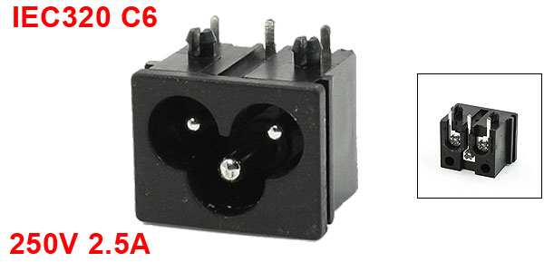 Product Name Socket Socket Type IEC320 C6 Power Supply 250V 2.5A Size 22 x 17 x 17mm/ 0.87" x 0.67" x 0.67" (L*W*H) Pin Width 1mm / 0.04" Pin Distance 7mm / 0.28" (for any 2 pins next to each other) Color Black Material Plastic, Metal Weight 7g Package Content 1 x IEC320 C6 Socket - Reviews