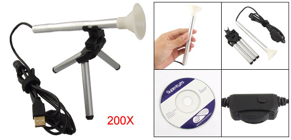 Product Name USB Microscope Application Scope for Personal, Household and Enterprise to observe tiny objects. Magnification Up to 200 times System Requirements Windows XP SP2 / Vista Windows 7 Pentium 450 Mhz, equivalent and above 10.5.5 Linux Interface USB 2.0 Case Material Aluminium Color Silver Tone Size 13 x 1 cm / 5.1" x 0.4" Weight 93g Package Content 1 x Pen Shape USB Microscope