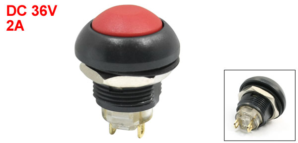 DetailsIndustrial 12mm DC 36V 2A Momentary Red Push Button Switch 1NO  Item Name Push Button Switch Action Type Momentary Type Contact 1NO Switch Rating DC 36V, 2A Pin Number 2 Thread Diameter 12mm/0.47" Total Size 20 x 20mm/0.8" x 0.8" (L*Max.W) Material Plastic, Electric Parts Housing Color Red, Black Net Weight 4g Package Content 1 x Push Button Switch