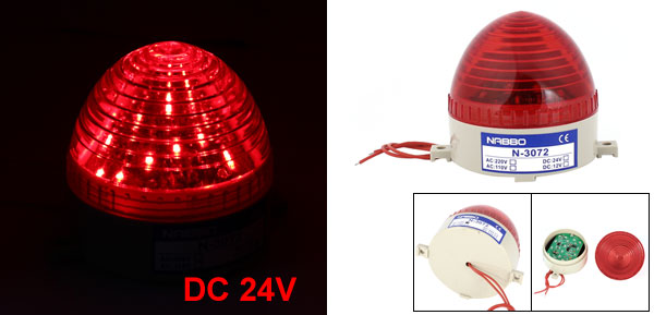 DetailsIndustrial DC 24V Red LED Blinking Warning Light Bulb Signal Tower Lamp N-3072  Product Name Industrial Signal Light Model N-3072 Type Flash Rated Voltage DC 24V Light Color Red Material Plastic, Electronic Parts Hole Diameter 5mm / 0.2" Wire Length 18cm / 7" Overall Size(Approx.) 7.7 x 8cm/ 3'' x 3.1"(Dia.*H) Body Color Red,Gray Weight 88g Package Content 1 x Industrial Signal Light