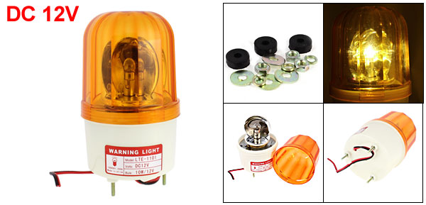 DetailsIndustrial DC24V Flash Emergency Rotary Warning Light Yellow  Product Name Industrial Signal Light Model LTE-1101 Voltage DC 12V Light Color Yellow Material Plastic, Electronic Parts Size 101 x 176mm / 4.0" x 7.0"(D*H) Mount Dia 4mm/ 0.20" Cable Length 20.5cm/10.6" Body Color Yellow, Ivory Net Weight 302g Package Content 1 x Industrial Signal Light