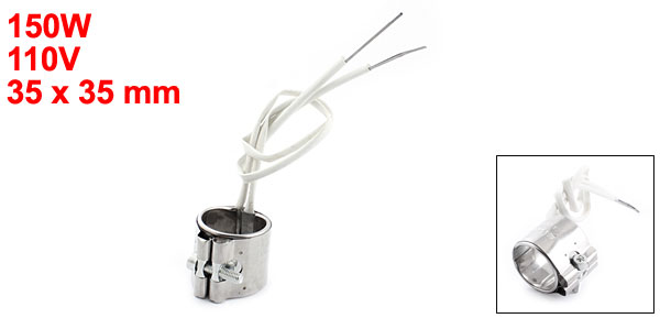 Product Name Band Heater Material Metal Power 150W Voltage 110V Band Size 35 x 35 mm/ 1.4" x 1.4"(Inside Dia.*H) Wire Length (Each) 30.5cm / 12" Color White, Silver Tone Net Weight 69g Package Content 1 x Band Heater - Reviews