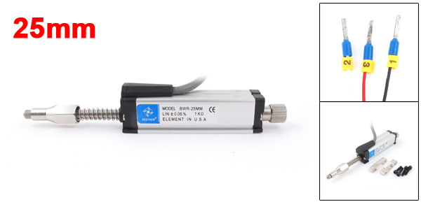 Product Name Linear Position Sensor Model BWR25 Type Self Reset Measuring Stroke 25mm Output Wire Quantity 3 Resistance 1K Ohm(+/-10%) Independent Linearity +/-0.05% Mechanical Stroke 28mm Resolution Infinite Max. Working Speed 5m/s Recommended Current <=10uA Recommended Temperature -60-+150C Body Size 71 x 18 x 18mm/2.8" x 0.7" x 0.7"(L*W*H) Wire Length 111cm/3.6Ft Rod Dia 5mm/0.2" Mounting Screw Dia M4/0.16" Materials Metal, Plastic Net Weight 111g Package Content 1 x Linear Position Sensor