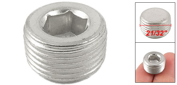 DetailsInternal Hex Head 21/32" Thread Dia Metal Plug Pipe Fitting  Product Name Hex Head Pipe Plug Color Silver Tone Material Metal Thread Diameter 16.5mm/ 21/32" Hex Side to Side Diatance 8.1mm/ 0.32" High 9.7mm/ 0.38" Net Weight 12g Package Content 1 x Hex Head Pipe Plug