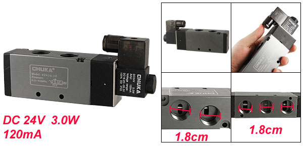 DetailsInternal Pilot DC 24V 2 Position 5 Ports Solenoid Valve  Product Name Solenoid Valve Model No. 4V410-15 Fluid 40 Micron Filtered Air Operation Type Internal Piloted Type 5 Way 2 Position Single Head Type Power Consumption DC 24V, 3.0W Amp 120mA Voltage Range DC 19.2V - 26.2V Pressure 0.15 -0.8MPa Joint Bore Size(Approx) Inlet=Outlet=Exhaust=PT1/2 Threaded Port Size(Approx) Air Inlet=Air Outlet=Exhaust=1.8cm / 0.708" Hex Connector Inner Dia(Approx) 1.1cm / 0.433" Overall Size(Approx) 16.6 x 3.3 x 7.4cm / 6.5" x 1.3" x 2.9" (L*W*H) Color See the Picture External Materila Plastic, Metal Weight 501g Package Content 1 x Solenoid Valve