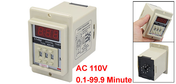 Product Name Digital Time Relay Type ASY-3D Rated Voltage AC 110V Frequency 50/60 Hz Contact AC 220V 5A Non-inductive Load Time Range 0.1-99.9 Minute Mount Size (Approx.) 49 x 68 x 61mm/ 1.9" x 2.7" x 2.4" (L*W*H) Mount Hole Diameter 4mm/ 0.16" Total Size 57 x 90 x 86mm/2.2" x 3.5" x 3.4"(L*W*H) Color Ivory Net Weight 210g Package Content 1 x Digital Time Relay - Reviews