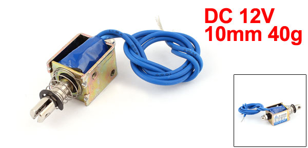 Brand DMiotech Country of Manufacture CHINA Cable Length 20cm/8" Model JF-0520B Action Form Push Pull Plunger Length 45mm/1.8" Stroke 10mm Material Metal, Electronic Parts Connection Hole Dia 2mm Force 40g Net Weight 23g Rated Voltage DC 12V Package Content 1 x DC Solenoid Electromagnet Current 800mA Body Size 20 x 16.5 x 13mm/0.8" x 0.65" x 0.5"(L*W*H) - Reviews