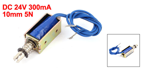 Main Color Silver Tone, Blue Brand DMiotech Country of Manufacture CHINA Action Type Push Type Cable Length 20cm/8 inches Model JF-0530B Stroke 10mm Material Metal Force 5N Net Weight 32g Rated Voltage DC 24V Package Content 1 x DC Solenoid Electromagnet Power On Type Continuous Current 300mA Body Size 56 x 15 x 13mm/ 2.2 x 0.6 x 0.5 inches (L*W*H) - Reviews