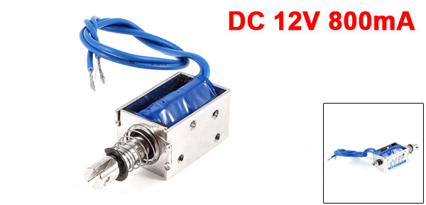 Product Name DC Solenoid Electromagnet Type JF-0630B Rated Voltage DC 12V Rated Current 800mA Action Form Push Pull Rated Stroke 10mm, 6N/0.6Kg Body Size(Approx) 30 x 15 x 20mm / 1.2"x 0.6" x 0.8" (L*W*H) Rod Dia 7mm / 0.27" Cable Length(Approx) 17cm / 1.6" External Material Metal, Electronic Parts Main Color Silver Tone, Blue Weight 43g Package Content 1 x DC Solenoid Electromagnet - Reviews