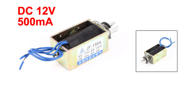Product Name DC Solenoid Electromagnet Type JF-1564 Rated Voltage DC 12V Rated Current 500mA Action Form Push Rated Stroke 10mm, 55N/5.5Kg Body Size(Approx) 60 x 30 x 35mm / 2.4"x 1.2" x 1.4" (L*W*H) Rod Dia 15mm / 0.6" Cable Length(Approx) 17cm / 1.6" External Material Metal, Electronic Parts Main Color Gold Tone, Blue Weight 318g Package Content 1 x DC Solenoid Electromagnet - Reviews