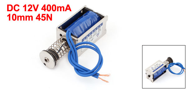 Main Color Silver Tone Brand DMiotech Country of Manufacture CHINA Cable Length 18cm/0.7" Model JF-205 Rated Voltage/Current DC 12V 400mA Stroke 10mm/ 0.4 inches Material Metal, Electronic Parts Force 45N Net Weight 188g Package Content 1 x DC Solenoid Electromagnet Action Push Type Body Size 50 x 30 x 27mm/2" x 1.2" x 1"(L*W*H) - Reviews
