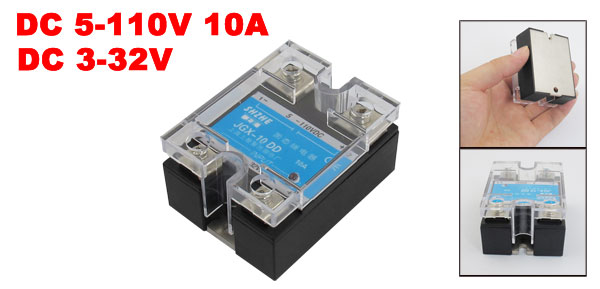 DetailsJGX-10DD DC to DC Covered Solid State Module Relay DC 3-32V DC 5-110V  Product Name Solid State Relay Type JGX-10DD Material Metal, Plastic Rated Load Current 10A Input DC 3-32V Output DC 5-110V Mounting Hole Size Small Dia:4.5mm/0.2" Big Size:6 x 4.3mm/0.24" x 0.2"(L*W) Total Size (Approx.) 5.8 x 4.4 x 3cm / 2.3" x 1.7" x 1.2" (L * W * H ) Color Black, Clear,Silver Tone Weight 94g Package Content 1 x Solid State Module Relay