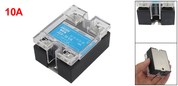 DetailsJGX-10VA 10A AC 24-480V Output Covered Adjustable Solid State Module Relay  Product Name Adjustable Solid State Module Relay Type JGX-10VA Material Metal, Plastic Rated Load Current 10A Load Voltage AC 24-480V Potentiometer Input Resistance 470-560KOhm(Potentiometer is not included) Input Power 2W Mounting Hole Size Small Dia:4.5mm/0.2" Big Size:6 x 4.3mm/0.24" x 0.2"(L*W) Total Size (Approx.) 5.8 x 4.4 x 3cm / 2.3" x 1.7" x 1.2" (L * W * H ) Color Black, Silver Tone Weight 93g Package Content 1 x Adjustable Solid State Module Relay