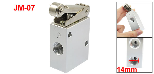 Product Name Mechanical Valve Model JM-07 Resetting Type Standard TypeActuator Type Roller Type Fluid Air Position and Way No. 2 Position 3 Way Pipe Thread Diameter 14mm Pipe Size 1/4 PT Hole Distance(Centre to Centre) 6mm/0.2" Working Pressure Range