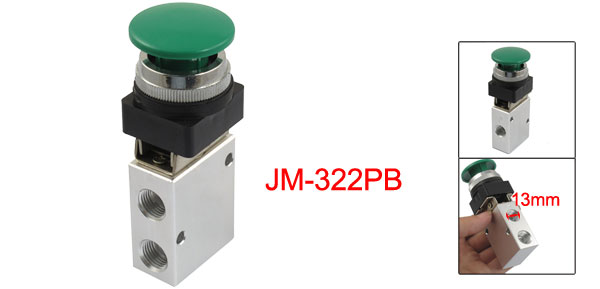 Product Name Mechanical Valve Model JM-322PB Control Type Manual ControlActuator Type Green Momentary Mushroom Push Button Working Medium Air Position and Way No. 2 Position 3 Way Pipe Thread Diameter Air Inlet=Air Outlet=Exhaust=13mm Pipe Size 1/4 PT Fixing Hole Diameter 5mm/0.2" Working Pressure Range