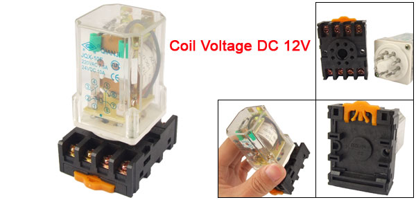 Product Name General Relay + Socket Model No. JQX-10F-3Z Coil Voltage DC 12V Contact Capacity 7.5A 220VAC 10A 24VDC Number of Pins 8 Overall Size (Approx.) 5.5 x 4 x 7.6cm/2.2" x 1.6" x 3" (L*W*H) Shell Material Plastic Main Color Black, Clear Weight 116g Package Content 1 x General Relay